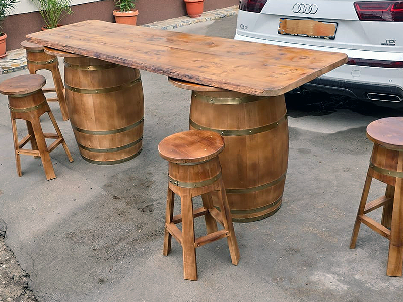 Bariuri și tejghele – realizate din butoaie mari, cu finisaj rustic sau modern.